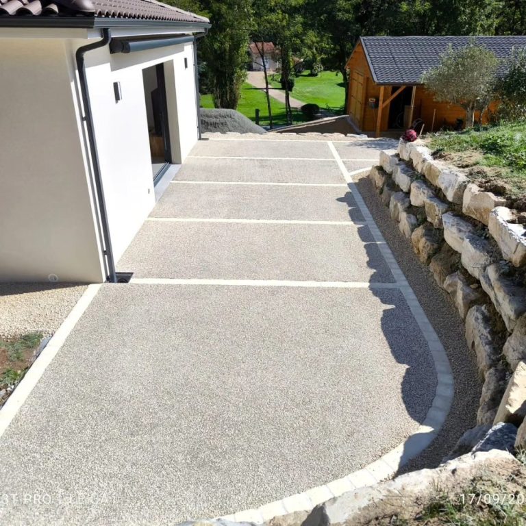 Ce béton à l'aspect gravillonné est obtenu par pulvérisation d'un désactivant en surface avant lavage. Il est antidérapant, esthétique et très résistant ; idéal pour les accès piétons ou véhicules.